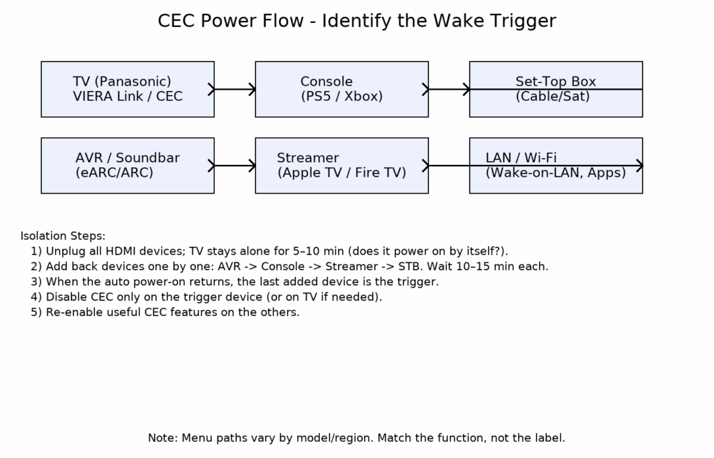 Unplug all HDMI devices and confirm the TV stays off; add devices back one by one and turn CEC Off only on the one that triggers the wake. If you don’t need CEC, turn off VIERA Link / HDMI Control on the TV.